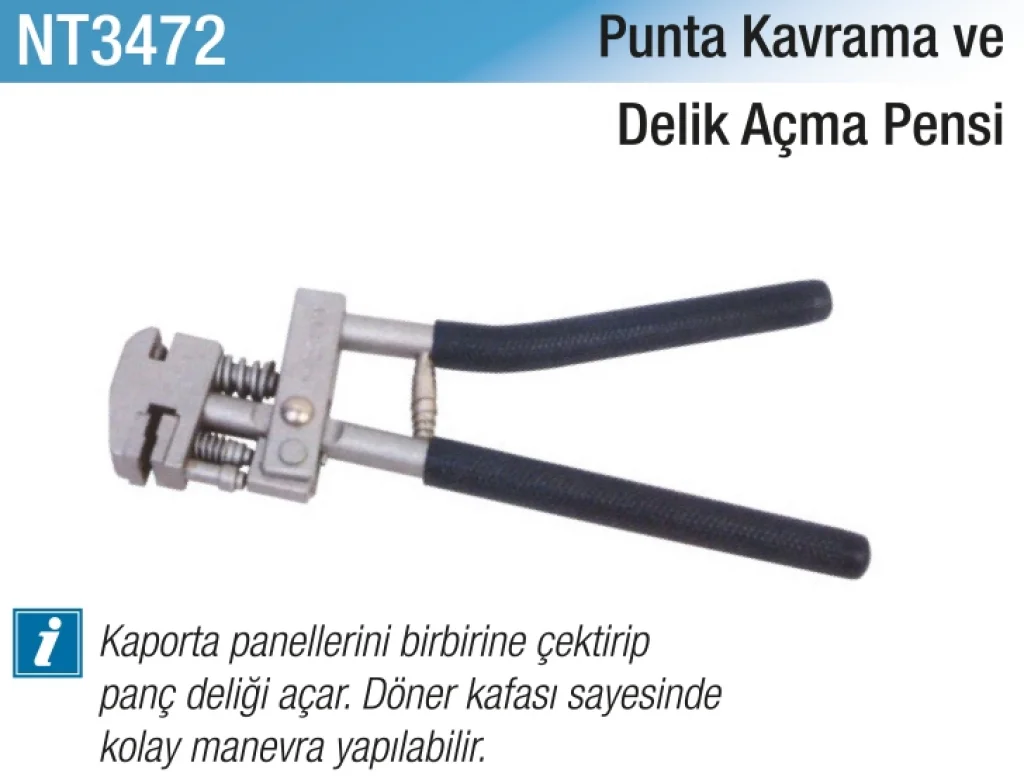 Punta Kavrama ve Delik Açma Pensi, metal işleme, sac montajı ve tamir işlerinde hassas kavrama ve delik açma işlemlerini kolaylaştırır.