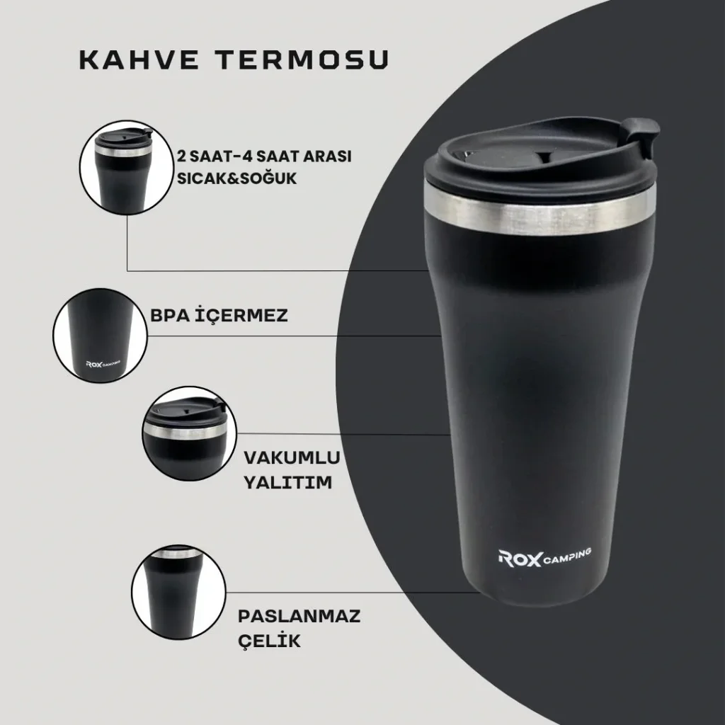 ROX CAMPING 0.45 LT Siyah Kahve Termosu, hafifliği, taşınabilirliği ve şık görünümü ile hem şehir yaşamında hem de kısa doğa gezilerinde yanınızdan ayırmak istemeyeceğiniz bir üründür. Günlük kahve rutininizi her yerde sürdürmenize olanak tanırken, sıcak veya soğuk içeceğinizi güvenle ve keyifle taşımanızı sağlar.