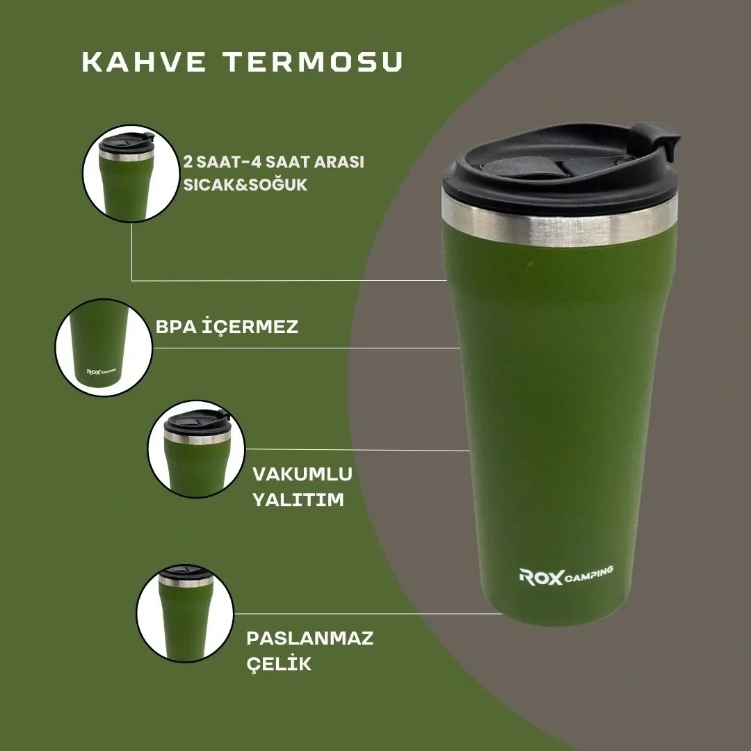 ROX CAMPING 0.45 LT Siyah Kahve Termosu, hafifliği, taşınabilirliği ve şık görünümü ile hem şehir yaşamında hem de kısa doğa gezilerinde yanınızdan ayırmak istemeyeceğiniz bir üründür. Günlük kahve rutininizi her yerde sürdürmenize olanak tanırken, sıcak veya soğuk içeceğinizi güvenle ve keyifle taşımanızı sağlar.