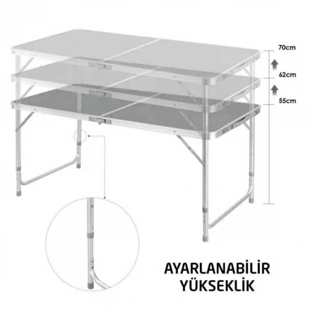 Katlanabilir tasarımı sayesinde masa birkaç saniye içinde açılıp kapanabilir ve taşıma sırasında minimum yer kaplar. Katlandığında kompakt bir forma dönüşerek araç bagajına kolayca sığar, taşıma çantası veya kulpları sayesinde rahatça taşınabilir. Kaymaz ayak uçları, zemine sıkıca tutunarak masa kullanım sırasında sallanma veya kayma yapmaz. Düz yüzeyi kolayca temizlenebilir yapıda olup, yağmur ve neme karşı dayanıklıdır. Bu özellikleri sayesinde hem kısa süreli pikniklerde hem de uzun kamp konaklamalarında güvenle kullanılabilir.