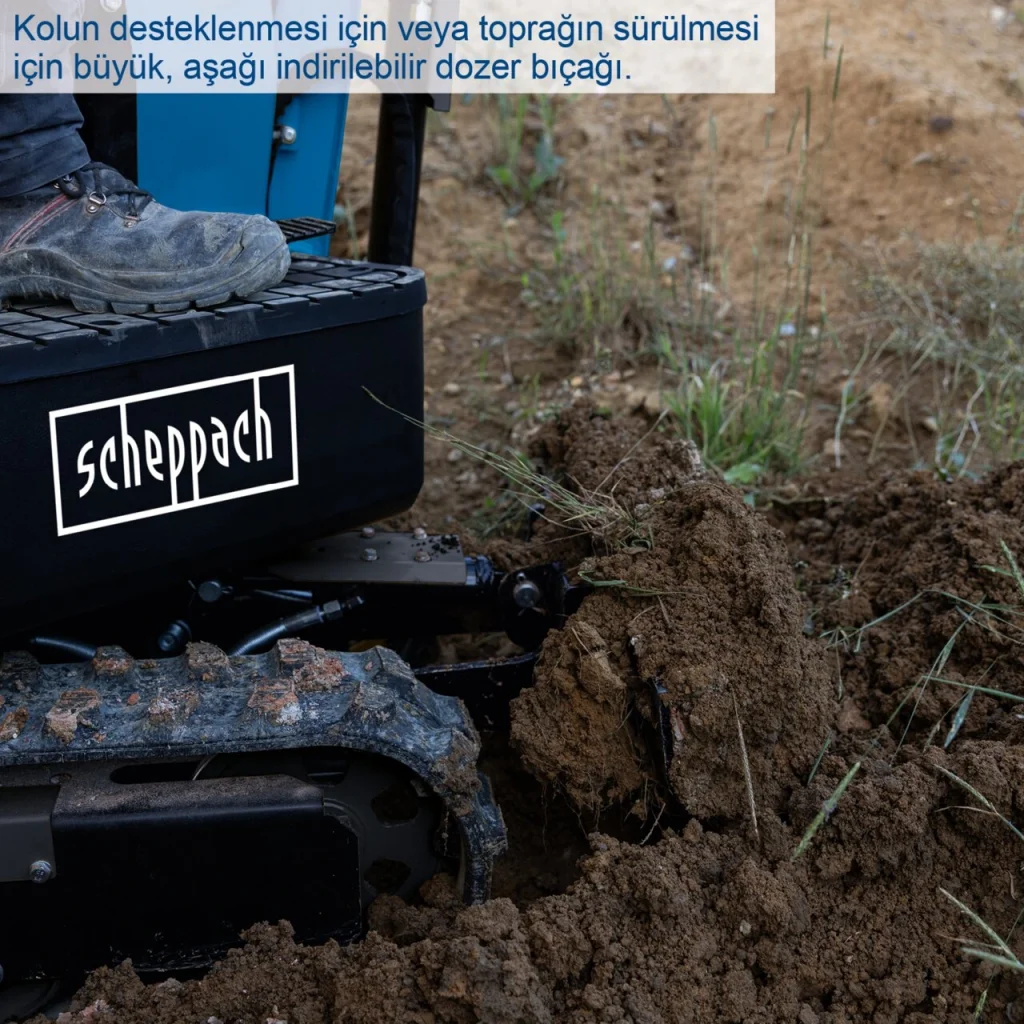 Scheppach Mini Ekskavatör, LED projektör aydınlatması sayesinde gece veya düşük ışık koşullarında da güvenli ve verimli çalışma olanağı sağlar. Bu sayede günün her saatinde işlerinizi kesintisiz sürdürebilirsiniz. Dayanıklı çelikten üretilmiş kepçesi, toprağı, taşı ve diğer ağır malzemeleri kolayca kazıp kaldırabilme kapasitesine sahiptir. Kepçenin güçlü hidrolik sistemi, uzun ömürlü ve yüksek performanslı bir kullanım sunar.