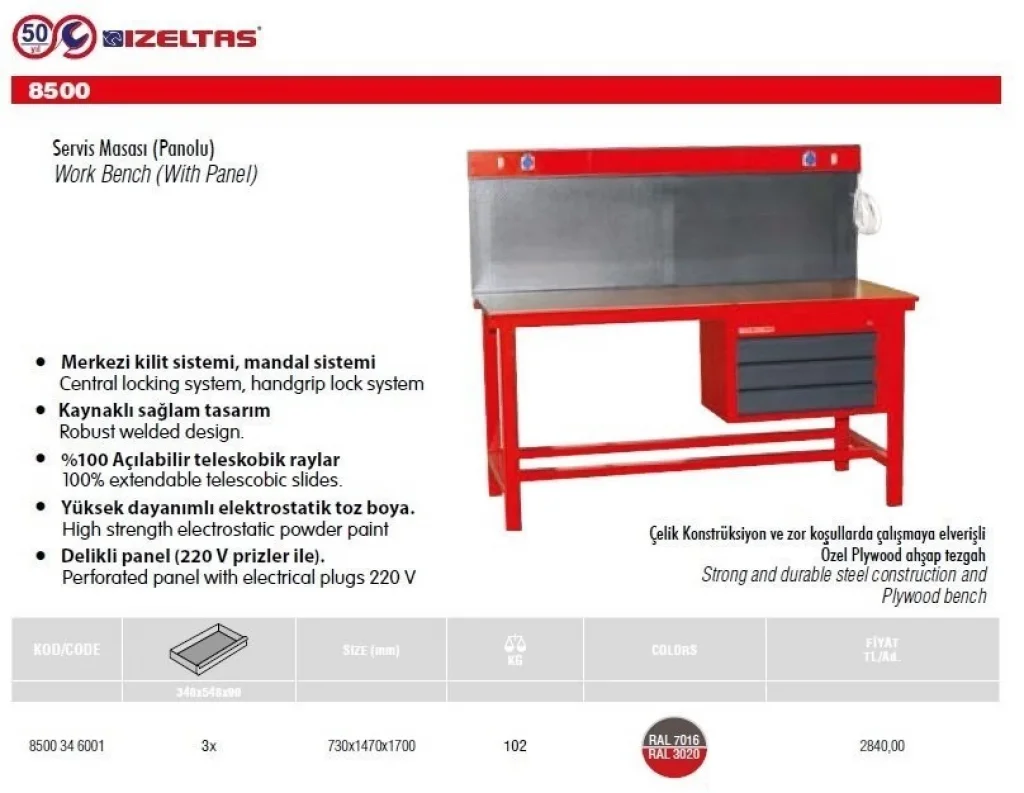 Bu panolu servis masası, rotil çektirme, boru kesme makası, makas, derin lokma takımı gibi diğer İzeltaş el aletleri ile mükemmel bir kombin oluşturur.