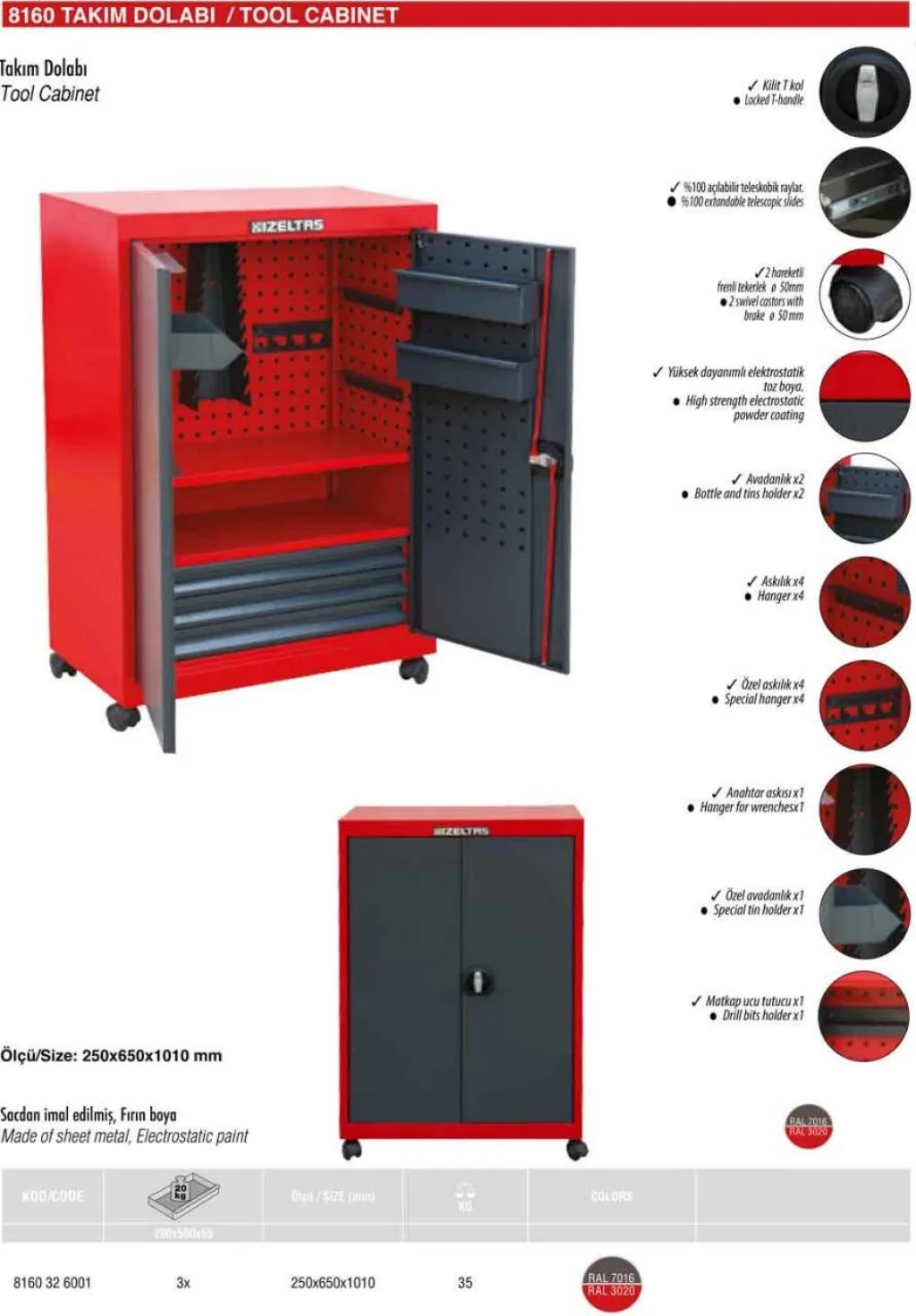 Bu takım dolabı, rotil çektirme, boru kesme makası, makas, derin lokma takımı gibi diğer İzeltaş el aletleri ile mükemmel bir kombin oluşturur.