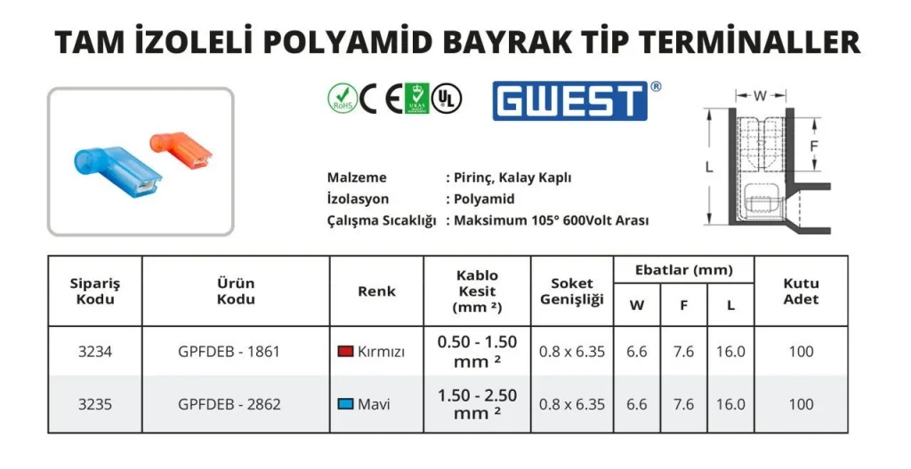Tam İzoleli Polyamid Bayrak Tip Terminaller, yüksek kaliteli polyamid malzeme ve mükemmel iletkenlik sağlayan metal yapısıyla, güvenli ve dayanıklı bir elektrik bağlantı çözümü sunar. Endüstriyel tesisatlar, otomotiv sektörü, elektrik pano montajları ve kablo bağlantıları gibi çeşitli alanlarda kullanıma uygundur.