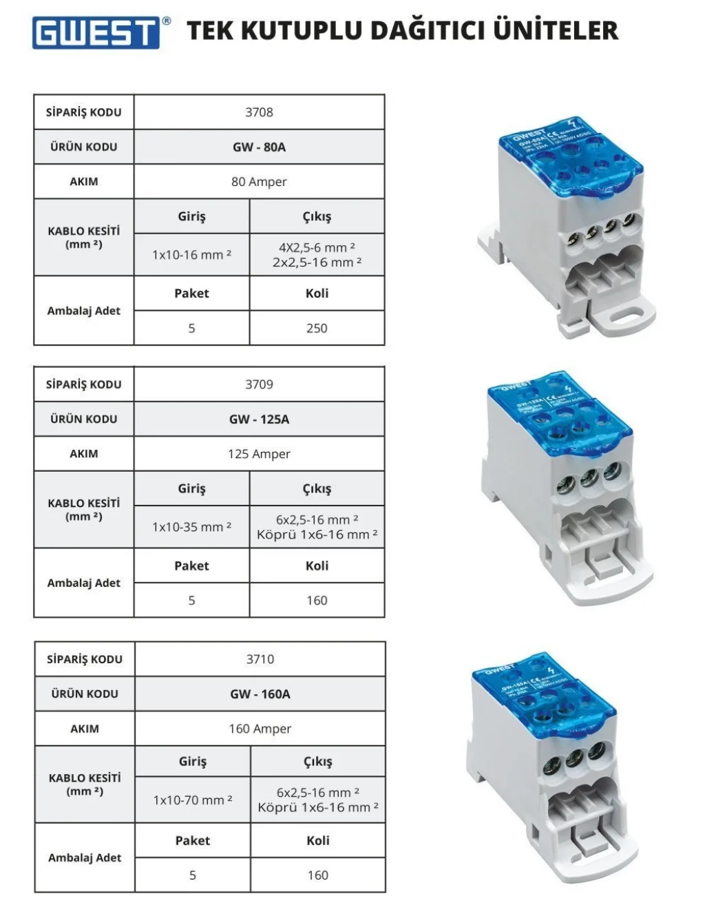 Ürün, 5 adet tek kutuplu dağıtıcı üniteden oluşur. Elektrik panoları, otomasyon sistemleri, kontrol kutuları ve enerji dağıtım uygulamalarında güvenle kullanılabilir. Hem teknik servislerde hem de montaj projelerinde sıklıkla tercih edilen bir bağlantı çözümüdür.