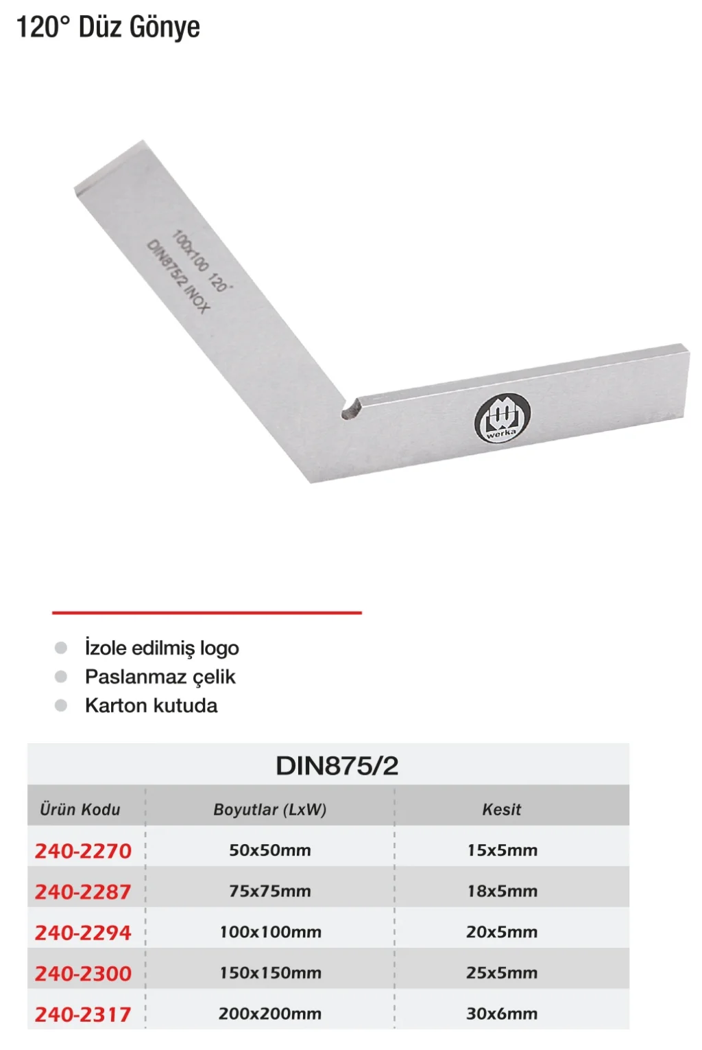 Werka 120° Düz Gönye, özel açı kontrolü gerektiren imalat ve montaj işlemleri için geliştirilmiş yüksek hassasiyetli bir ölçüm aracıdır. Açılı parça üretimi, kaynak planlaması ve makine montajı gibi işlemlerde 120° açının doğruluğunu sağlar. Sertleştirilmiş çelikten üretilmiş gövdesi, uzun yıllar boyunca ölçüm doğruluğunu korur. Referans düzlemleriyle mükemmel temas sunar. Endüstriyel üretim hatlarında, metal ve alüminyum işleme sektörlerinde sıkça kullanılır.