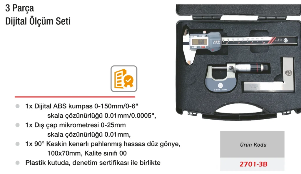 Werka 3 Parça Dijital Ölçüm Seti, dijital kumpas, dijital mikrometre ve kompratör saatinden oluşarak, tüm temel ölçüm ihtiyaçlarını karşılayan eksiksiz bir çözümdür. Yüksek hassasiyetli cihazlar, hem üretim hem kalite kontrol aşamalarında güvenle kullanılır. Ergonomik tasarımlar, net dijital göstergeler ve dayanıklı gövde yapısıyla kullanıcı dostu ve uzun ömürlüdür. Her cihaz, farklı ölçüm fonksiyonları ile maksimum doğruluk sağlar. Taşıma çantasıyla birlikte sunulan set, düzenli ve güvenli saklama imkânı sunar.