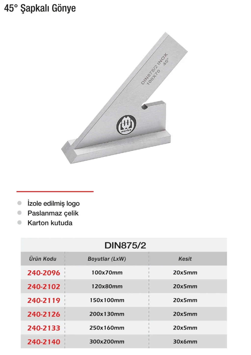 Werka 45° Şapkalı Gönye, DIN875/2 standardına uygun olarak üretilmiş ve özel açılı ölçüm işlemlerinde pratik çözüm sunar. Şapkalı tasarımı sayesinde yüzeylere sabit ve kararlı yerleşerek açının doğru şekilde kontrol edilmesini sağlar. Özellikle metal işleme, borulama ve sac kıvırma işlemlerinde 45° açı kontrolü kritik öneme sahiptir. Taşlanmış ve sertleştirilmiş yüzeyleriyle uzun ömürlü, hassas ve profesyonel bir ölçüm aracıdır.
