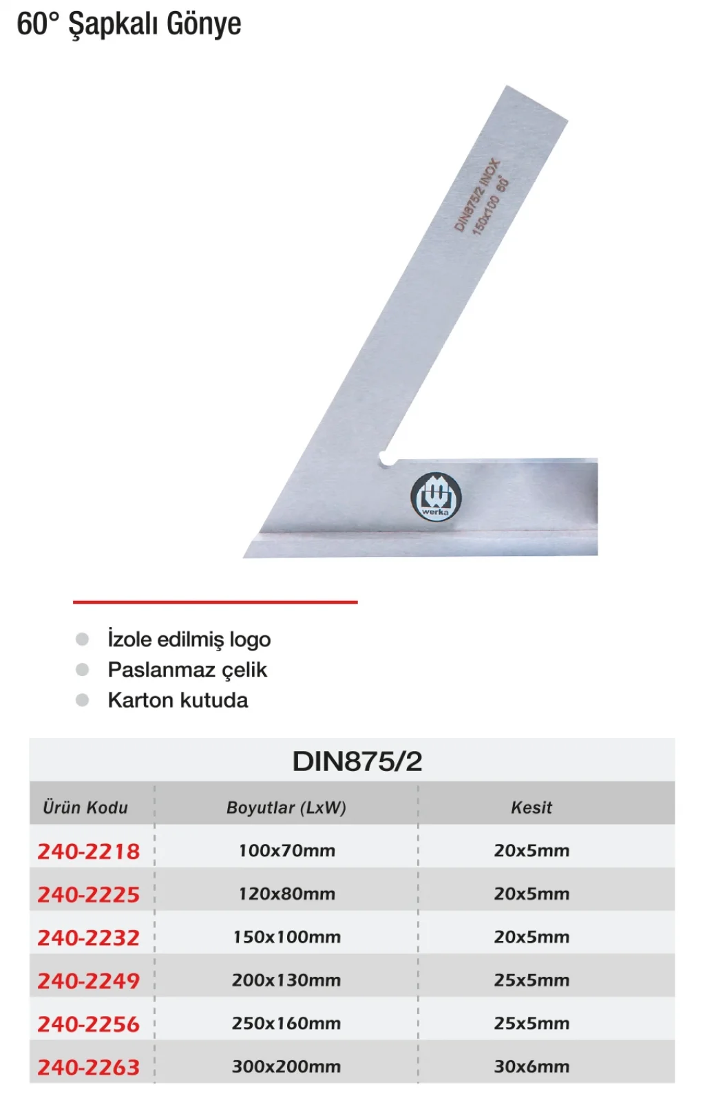 Werka 60° Şapkalı Gönye DIN875/2, özel açılı ölçüm ve yerleştirme gerektiren teknik işlerde kullanılmak üzere tasarlanmıştır. Şapkalı yapısı, sabit ve sağlam yerleşim sunarak ölçüm hassasiyetini artırır. Taşlanmış yüzeyleri ve sertleştirilmiş çelik gövdesi sayesinde deformasyona karşı dirençlidir. Kalıp ve aparat imalatı, özel açılı kaynak uygulamaları ve metal yapı üretiminde ideal yardımcı araçtır. DIN875/2 standardı doğrultusunda hassasiyet sunar.
