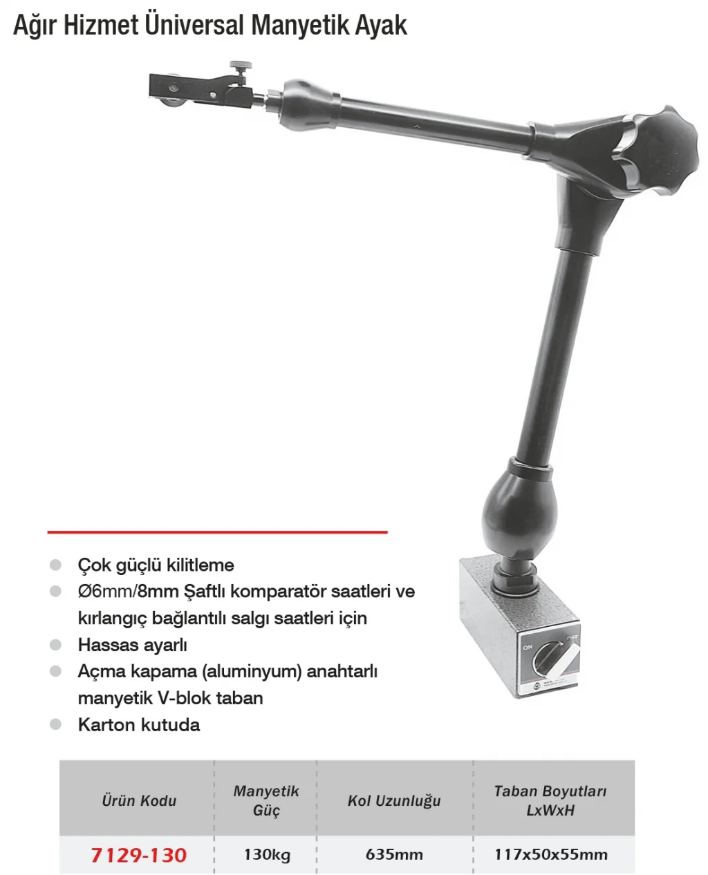 Werka Ağır Hizmet Üniversal Manyetik Ayak 130 kg, güçlü mıknatısı sayesinde büyük iş parçaları veya titreşimli ortamlar için maksimum stabilite sunar. Salgı saati, kompratör saati ve diğer ölçüm cihazlarını sabitlemek için idealdir. Esnek mafsallı kol yapısı sayesinde ölçüm cihazınızın yönünü istediğiniz gibi ayarlayabilir, çok açılı ölçüm imkanına sahip olursunuz. Endüstriyel dayanıklılığı ve yüksek çekim gücü ile hassasiyetin kritik olduğu uygulamalarda tercih edilir.