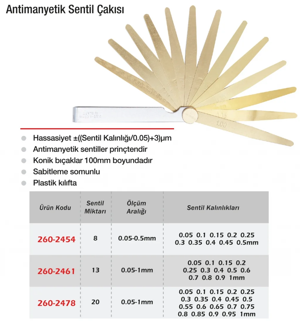 Werka Antimanyetik Sentil Çakısı, elektronik komponentlerin yakınında veya manyetik alan altında yapılacak kalınlık ölçümleri için özel olarak geliştirilmiştir. Sentil yaprakları, farklı kalınlıklarda olup paslanmaz ve antimanyetik özelliktedir. Katlanabilir tasarımı sayesinde kolay taşınabilir ve güvenli saklama imkanı sunar. Motor ayarı, kalıp kontrolü ve hassas parça montajında kritik boşlukların tespiti için ideal bir araçtır. Özellikle elektrikli sistemlerde, hassas mekanik bileşenlerde kullanılması önerilir. Güvenli, dayanıklı ve yüksek hassasiyetli bir çözümdür.