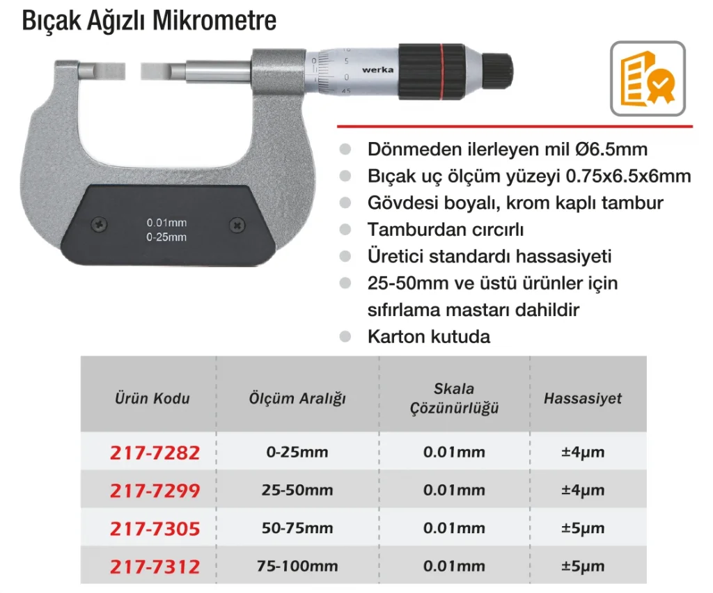 Werka Bıçak Ağızlı Mikrometre, dar ve zor erişilen alanlarda hassas dış çap ölçümleri için tasarlanmıştır. Özel bıçak ağız tasarımı, karmaşık parçalarda bile ölçüm kolaylığı sağlar. Sağlam yapısı ve hassas mekanizması ile güvenilir ölçümler sunar. Endüstriyel uygulamalarda, kalite kontrol ve hassas üretim süreçlerinde vazgeçilmez bir araçtır. Ergonomik tutuşu ile kullanım rahatlığı sağlar.