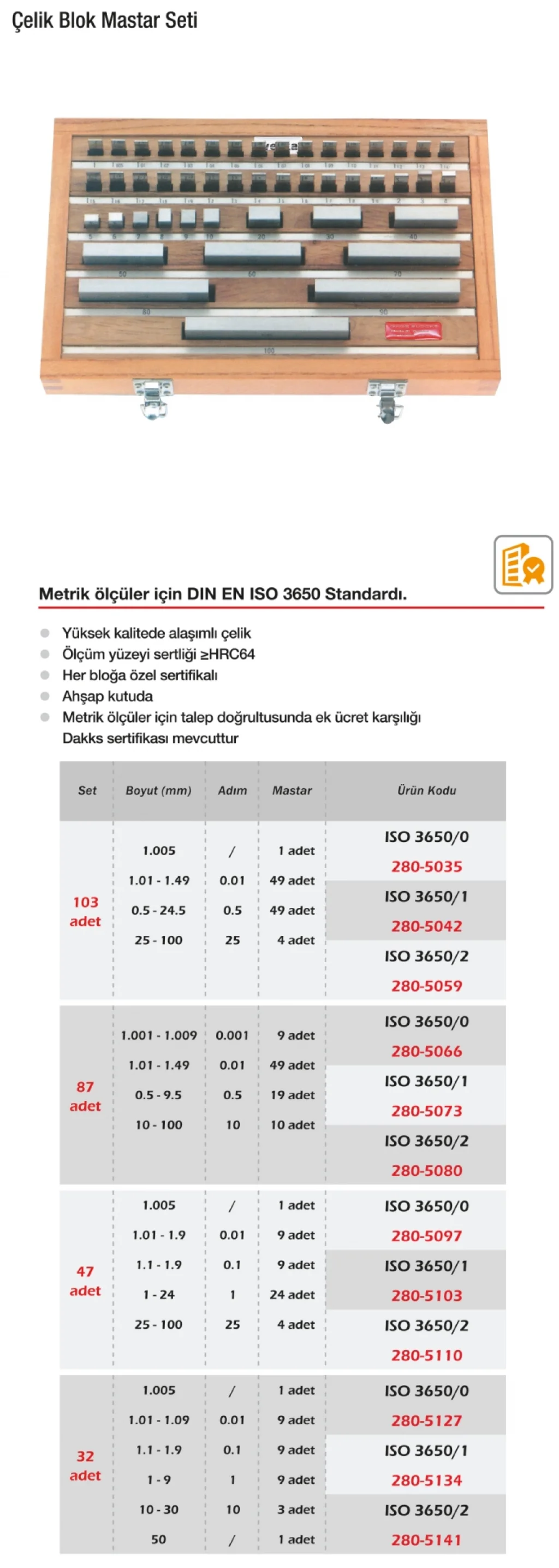 Werka Çelik Blok Mastar Seti ISO 3650/1, yüksek hassasiyet sınıfında mikrometre kalibrasyonu için geliştirilmiş çelik bloklardan oluşur. Bu set, ölçüm cihazlarının en yüksek doğrulukta kalibre edilmesini mümkün kılarak üretim kalitesinin yükseltilmesine katkıda bulunur. ISO 3650/1 standartlarına uygunluk ve dayanıklı yapı, laboratuvar ortamlarında uzun ömürlü kullanım sağlar. Üretim ve kalite kontrol süreçlerinde ölçüm hatalarını minimize eder ve güvenilir veri sağlar.