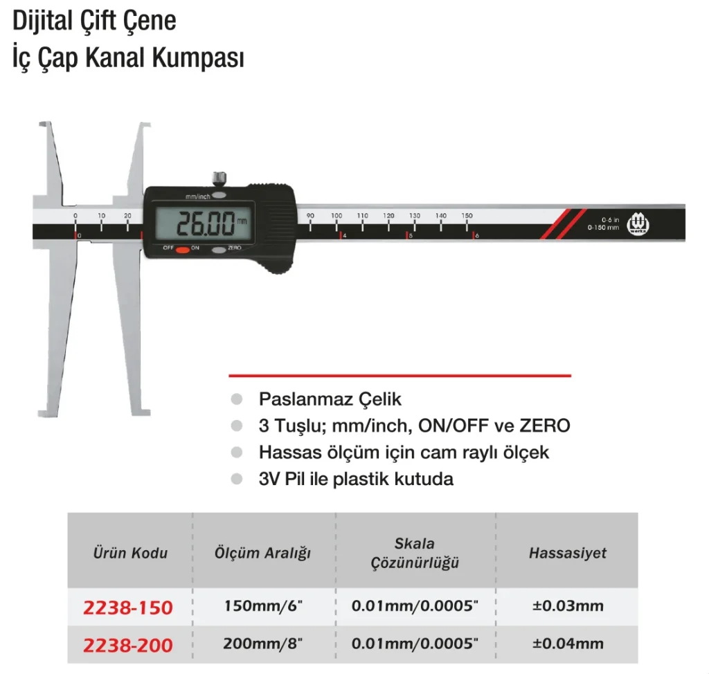 Werka Dijital Çift Çene İç Çap Kanal Kumpası, boru ve kanal iç çaplarını hassas ve kolay ölçmek için özel olarak tasarlanmıştır. Çift çene yapısı ölçüm stabilitesi sağlar. Dijital ekranı, ölçüm sonuçlarının hızlı okunmasını mümkün kılar. Dayanıklı malzemesi ve ergonomik tasarımı ile saha ve endüstriyel uygulamalarda güvenilir bir ölçüm aracıdır.