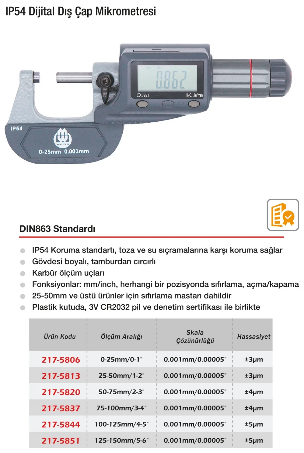 Werka Dijital Dış Çap Mikrometresi, yüksek hassasiyetle dış çap ölçümleri yapmanızı sağlayan kullanışlı bir dijital ölçüm aracıdır. Kolay okunabilen dijital ekranı, ölçüm sürecini hızlandırır ve hata payını azaltır. Dayanıklı ve ergonomik tasarımı, uzun süreli kullanımda kullanıcı konforunu artırır. Endüstriyel üretim ve kalite kontrol süreçlerinde güvenle tercih edilir. Hassas dış çap ölçümleriniz için ideal çözümdür.