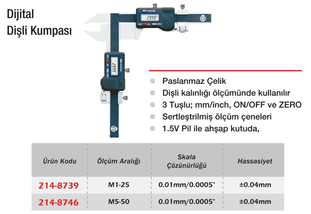 Werka Dijital Dişli Kumpası, diş çapı ve diş aralığı ölçümlerinde yüksek hassasiyet sunar. Dijital ekranı sayesinde ölçüm sonuçlarını hızlı ve kolay okunabilir biçimde gösterir. Sağlam yapısı, uzun ömürlü kullanım sağlar. Endüstriyel ve teknik uygulamalarda dişli parçaların ölçümünde güvenilir performans sunar. Kolay kullanımı ve ergonomik tasarımı ile ölçüm işlerinizi kolaylaştırır.