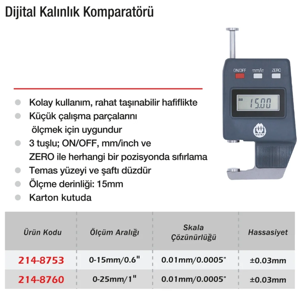 Werka Dijital Kalınlık Kompratörü, sac, plastik, cam ve diğer düz yüzeyli malzemelerin kalınlığını ölçmek için kullanılan dijital göstergeli bir ölçüm cihazıdır. Ölçüm sonuçlarını anlık olarak dijital ekranda gösterir. Yüksek çözünürlüğü ve hızlı tepki süresiyle özellikle kalite kontrol süreçlerinde operatörlere büyük kolaylık sağlar. Ayarlanabilir temas çeneleri sayesinde farklı kalınlık aralıklarında kullanılabilir. Taşınabilir, dayanıklı ve kullanım kolaylığı sağlayan yapısıyla üretim ve denetim alanlarının vazgeçilmezlerinden biridir.