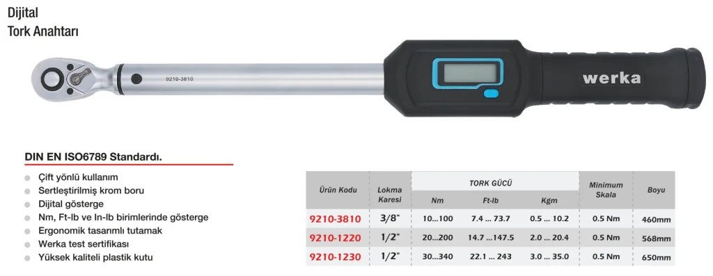 Werka Dijital Tork Anahtarı, endüstriyel kullanım için tasarlanmış yüksek kaliteli ve dayanıklı bir tork kontrol cihazıdır. Hassas tork ölçümü yapabilen bu anahtar, işlevselliği ile ön plana çıkar. Profesyonel kullanım için ideal bir seçimdir.