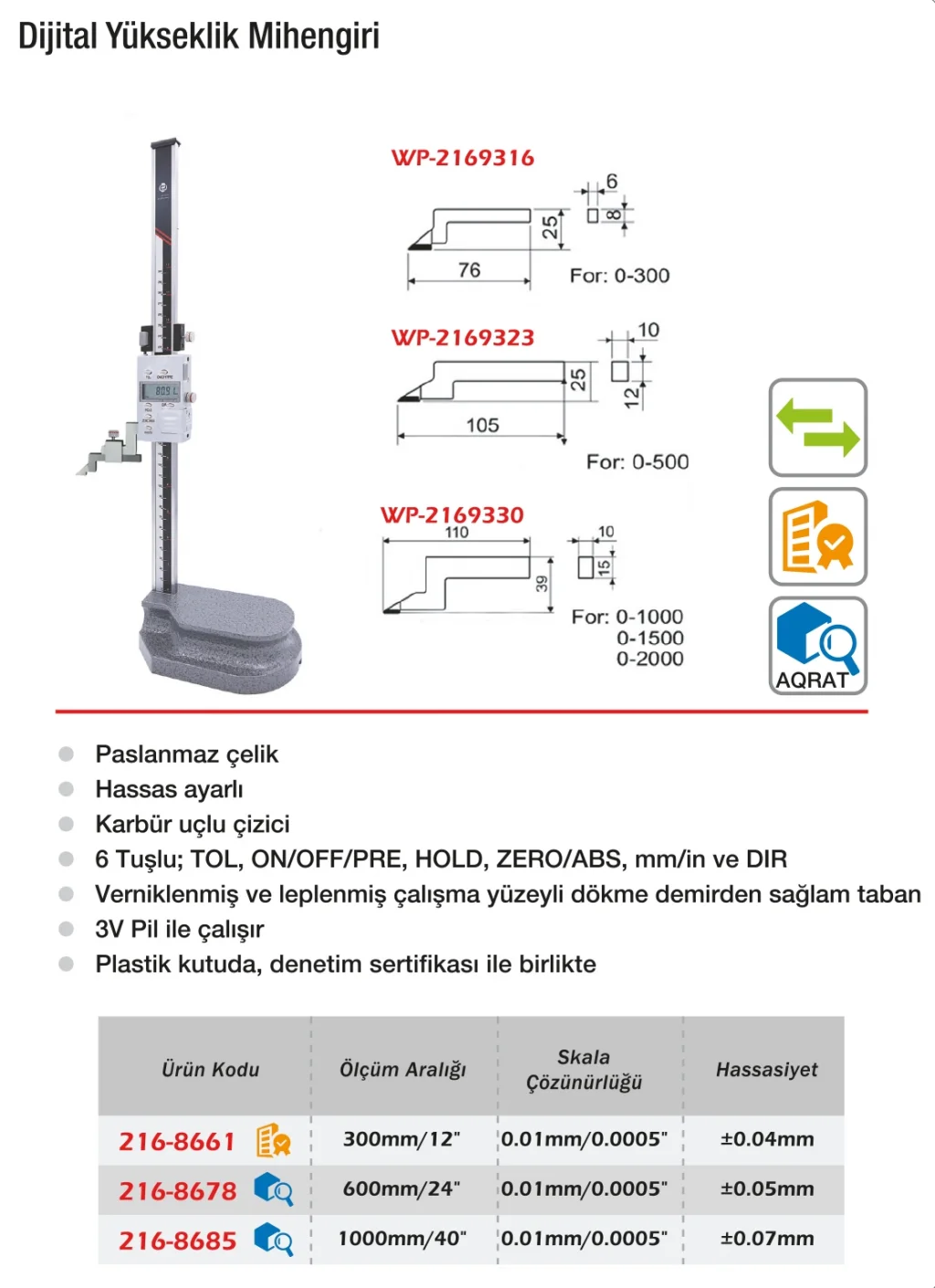 Werka Çift Kolon Saatli Yükseklik Mihengiri, yüksek stabilite sunan çift kolon yapısı ile hassas yükseklik ölçümleri yapmanızı sağlar. Saatli gösterge, ölçüm değerlerini net ve doğru gösterir. Dayanıklı malzemelerden üretilmiş olup, uzun süreli teknik ve endüstriyel kullanımlar için uygundur. Ergonomik tasarımı ve hassas mekanizması ile kalite kontrol ve üretim hatlarında tercih edilen bir üründür.