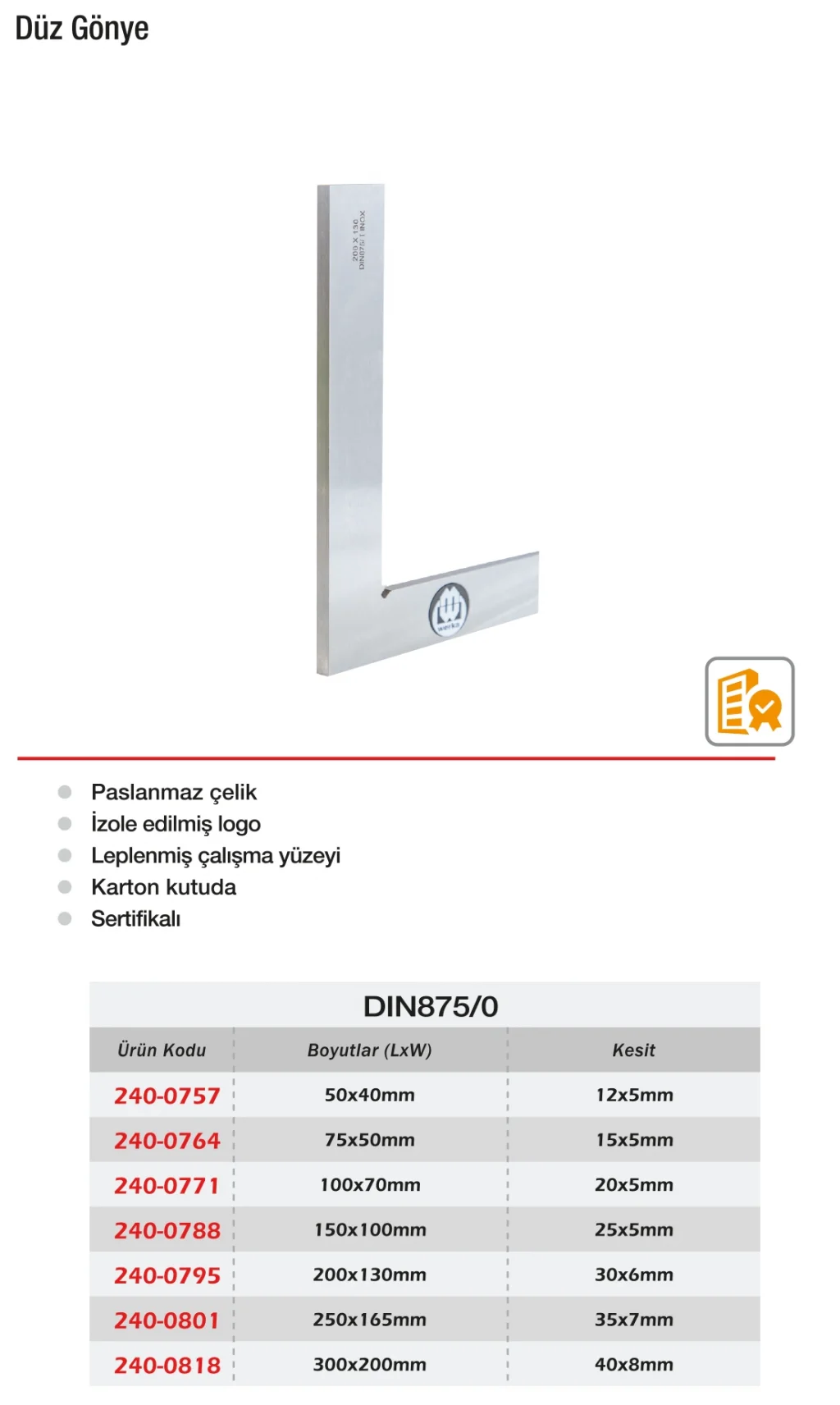 Werka Düz Gönye serisi, DIN875 normlarına uygun olarak DIN875/2 (standart), /1 (hassas) ve /0 (yüksek hassasiyetli) olarak sınıflandırılmıştır. Sert çelikten üretilen ve yüzeyleri taşlanarak işlenen bu gönye modelleri, dik açı kontrolünde maksimum doğruluk sağlar. CNC makinelerde işlenen parçaların kontrolü, kalıp ayarları ve montaj doğruluğu gibi işlemlerde güvenilir referans aracı olarak kullanılır. Uygun fiyatlı, sağlam ve uzun ömürlü bu gönye setleri, kalite kontrol, üretim, montaj ve eğitim alanlarında yaygın kullanım bulur.