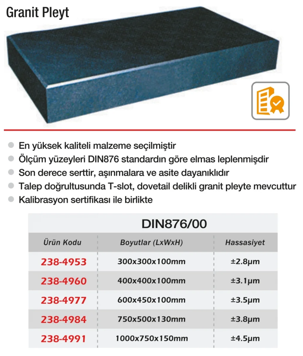 DIN876/00 standardındaki Werka Granit Peleyt, maksimum düzlemsellik toleransı ile metrologi ve laboratuvar uygulamaları için geliştirilmiştir. Bu ultra hassas yüzey, mikron seviyesindeki ölçüm hatalarını ortadan kaldırmak üzere taş işçiliğinin ve yüksek teknoloji üretiminin birleşimiyle oluşturulmuştur. Sıfıra yakın termal genleşme katsayısı sayesinde sıcaklık değişimlerinden etkilenmez. Mikrometre, komparatör, yük hücresi gibi yüksek hassasiyetli cihazların kalibrasyonunda referans düzlem olarak güvenle kullanılır.