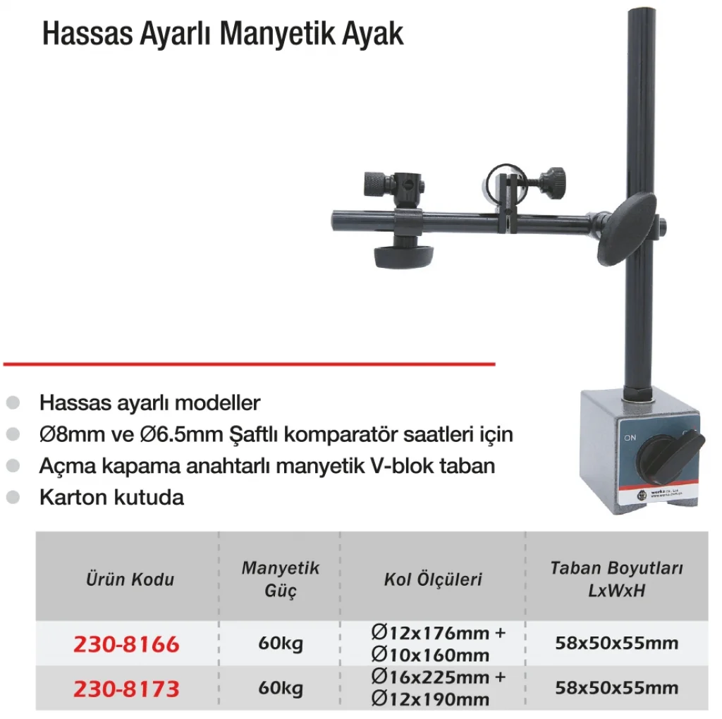 Werka Hassas Ayarlı Manyetik Ayak, mikro ayar mekanizması sayesinde ölçüm cihazlarının pozisyonunu en ince ayrıntısına kadar ayarlamanıza olanak tanır. Komparatör saati, salgı saati ve dijital göstergeler ile tam uyumludur. Yüksek tutunma gücüyle stabil çalışma sağlarken, hassasiyet gerektiren ölçümlerde ideal bir destekleyici ekipmandır. Laboratuvar, kalite kontrol ve ince işleme gerektiren ortamlarda yüksek performans sunar.