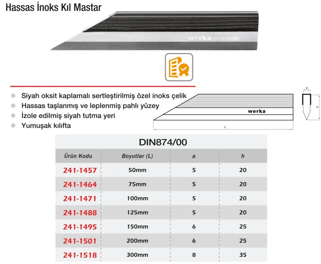 Werka Hassas İnoks Kıl Mastar, yüksek ölçüm doğruluğu gerektiren uygulamalarda ideal bir referans mastardır. Paslanmaz çelik (inoks) malzemeden üretilmiş olması, uzun süreli kullanımlarda oksidasyona karşı üstün dayanıklılık sunar. İnce kıl formu sayesinde dar alanlarda ölçüm yapmayı kolaylaştırır. Özellikle kalibrasyon işlemleri, referans kontrolü ve takım ayarlarında kullanılır. Laboratuvar, kalite kontrol ve ölçüm odalarında sıkça tercih edilen bu ürün, üretim doğruluğunu garanti altına alır.