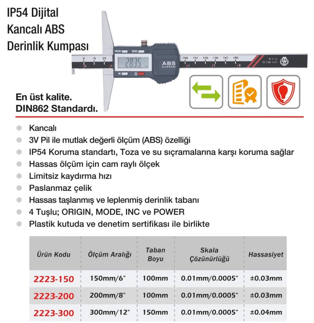 Werka IP54 Kancalı ABS Dijital Derinlik Kumpası, su ve toz sıçramalarına karşı koruma sağlar. ABS gövdesi dayanıklılık ve hafiflik sunar. Kanca uçlu yapısı sayesinde farklı yüzeylerde derinlik ölçümlerini kolaylaştırır. Dijital ekranı ölçüm sonuçlarının net okunmasını sağlar. Endüstriyel ve teknik uygulamalarda güvenilir ve pratik kullanım imkanı sağlar.