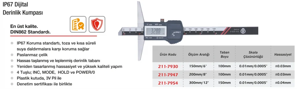 Werka IP67 Dijital Derinlik Kumpası, su ve toz geçirmez yapısı ile zorlu saha koşullarında bile üstün performans gösterir. Hassas dijital ölçüm sistemiyle derinlik ölçümlerinde yüksek doğruluk sağlar. Ergonomik ve sağlam yapısı uzun ömürlü kullanım imkanı verir. Endüstri, otomotiv ve teknik servislerde tercih edilen güvenilir bir ölçüm aracıdır.