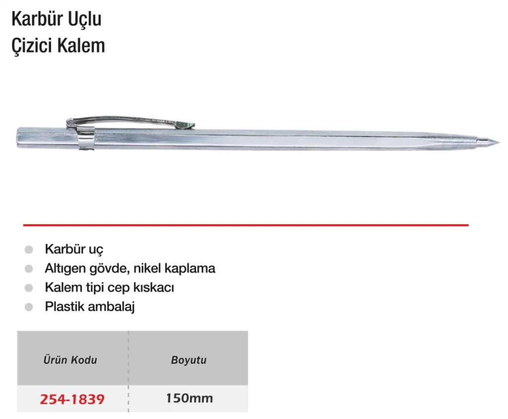 Werka Karbür Uçlu Çizici Kalem 150mm, camdan seramiğe, sert metallerden taşa kadar birçok farklı yüzeyde net ve kalıcı işaretlemeler yapabilen profesyonel bir işaretleme aracıdır. Tungsten karbür uç, yüksek sertliği sayesinde uzun süre keskinliğini korur. Ergonomik tutuş sağlayan gövde yapısı, uzun süreli kullanımlarda bile el yorgunluğunu azaltır. 150 mm uzunluğu, kullanım esnasında denge ve rahatlık sağlar. Atölye, üretim hattı ve teknik çizimlerde kullanım için idealdir. Net, temiz ve hassas işaretlemeler yaparak üretim hatalarını azaltır.