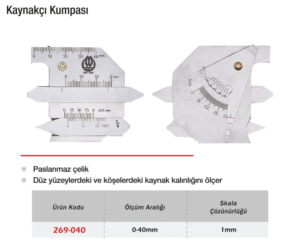 Werka Kaynakçı Kumpası 0-40mm, kaynak dikişlerinin ölçümünde yüksek hassasiyet ve pratiklik sunan bir ölçüm aracıdır. 0 ila 40 mm arasında hızlı ve güvenilir ölçümler yapabilen bu cihaz, hem üretim sahalarında hem de kontrol laboratuvarlarında kullanıma uygundur. Dayanıklı çelik gövdesi ve paslanmaz yapısı sayesinde zorlu sanayi koşullarında bile uzun ömürlü performans sağlar. Ergonomik tasarımı sayesinde kullanıcıya kolay kullanım imkanı sunar. Bu kumpas, kaynak dikiş kalınlığı, boşluk ve yüksekliği gibi kritik ölçümleri hassasiyetle yaparak üretim kalitesini artırır. Kaynakçıların ve kalite kontrol mühendislerinin vazgeçilmez bir aracı olan Werka 0-40mm kumpas, kompakt boyutuyla da kolay taşınabilirlik sağlar.