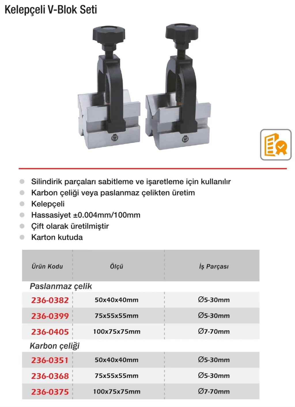 Werka Kelepçeli V-Blok Seti – Karbon Çeliği, silindirik iş parçalarının ölçüm ve işleme süreçlerinde sabitlenmesi için geliştirilmiştir. Blokların V şeklindeki kanalı ve güçlü üst kelepçesi, parça hareketini engeller. Karbon çelik gövdesi ile dayanıklı ve uzun ömürlüdür. Mil salgı ölçümleri, torna merkezleme, taşlama öncesi hizalama gibi işlemlerde hassasiyet sağlar. Standart atölye ölçüm sistemlerine uygundur.
