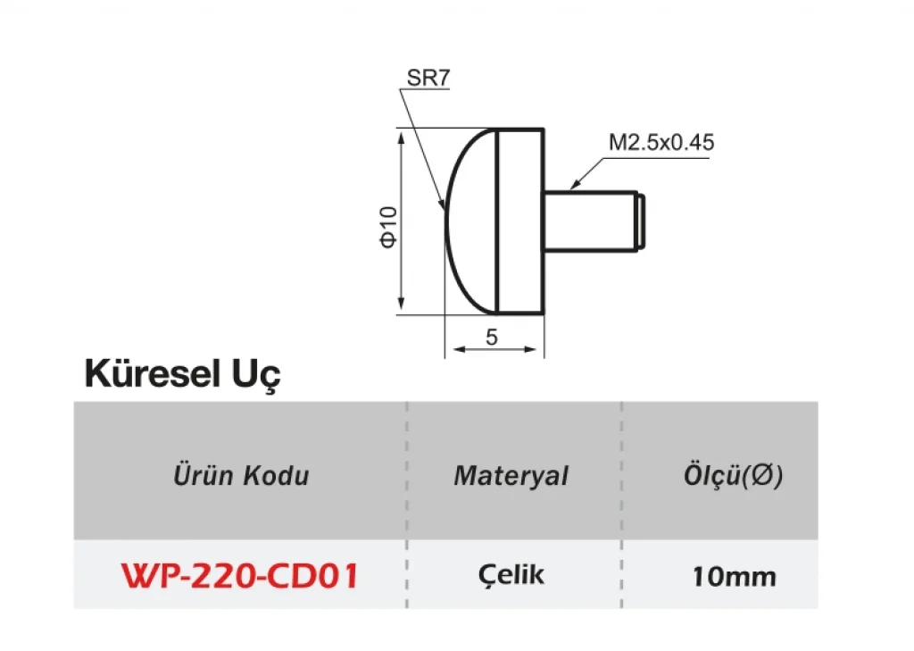 Ø10 Çelik Küre Temas Ucu, yüksek sertlik derecesine sahip çelikten imal edilmiştir. Özellikle ölçüm cihazları ve kontrol sistemlerinde temas noktası olarak görev alır. Küresel formu sayesinde yüzeye eşit temas eder ve doğru ölçüm sağlar.