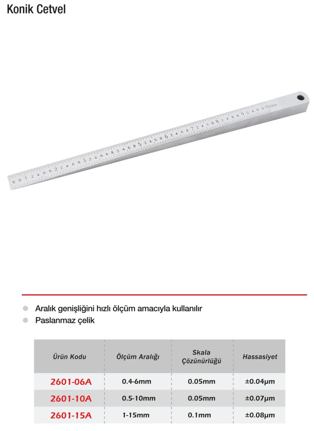 Werka Konik Cetvel, iç çap ve dış çap ölçümlerinde konik yapıların derecesini değerlendirmek amacıyla kullanılan profesyonel bir ölçüm aracıdır. Cetvel üzerinde konik ölçüm aralıkları düzgün şekilde yerleştirilmiştir. Dayanıklı paslanmaz çelik yapısı sayesinde üretim ortamlarında aşınmaya karşı dirençlidir. Özellikle torna, boru imalatı ve pres parçalarında koniklik oranlarını ölçmek için tercih edilir. Taşınabilir ve hafif yapısıyla saha kullanımına da uygundur. Net işaretlemeleri sayesinde ölçüm hatalarını minimize eder. Teknik personel, kalite kontrol ve üretim mühendisleri için vazgeçilmez bir yardımcıdır.