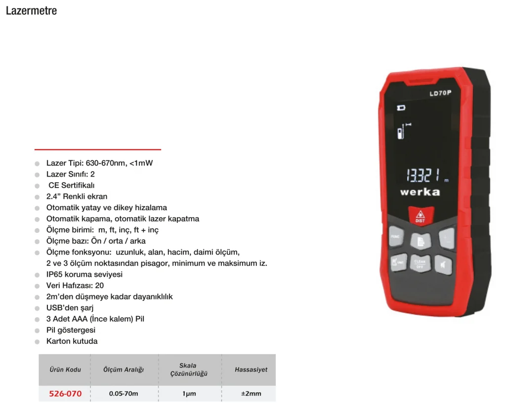 Werka Lazermetre 70m, uzun mesafe ölçümlerini hızlı, güvenilir ve zahmetsiz hale getiren profesyonel bir lazerli ölçüm cihazıdır. 70 metreye kadar net ve doğru ölçüm yapabilen bu cihaz, inşaat, iç mimarlık, dekorasyon ve tesisat sektörlerinde büyük avantaj sağlar. Tek tuşla ölçüm alma, alan ve hacim hesaplama gibi gelişmiş özelliklerle donatılmıştır. Arka aydınlatmalı ekranı sayesinde düşük ışıkta bile kullanım kolaylığı sunar. Hafif yapısı, sağlam dış gövdesi ve uzun ömürlü pil performansıyla sahada ideal çözümdür.