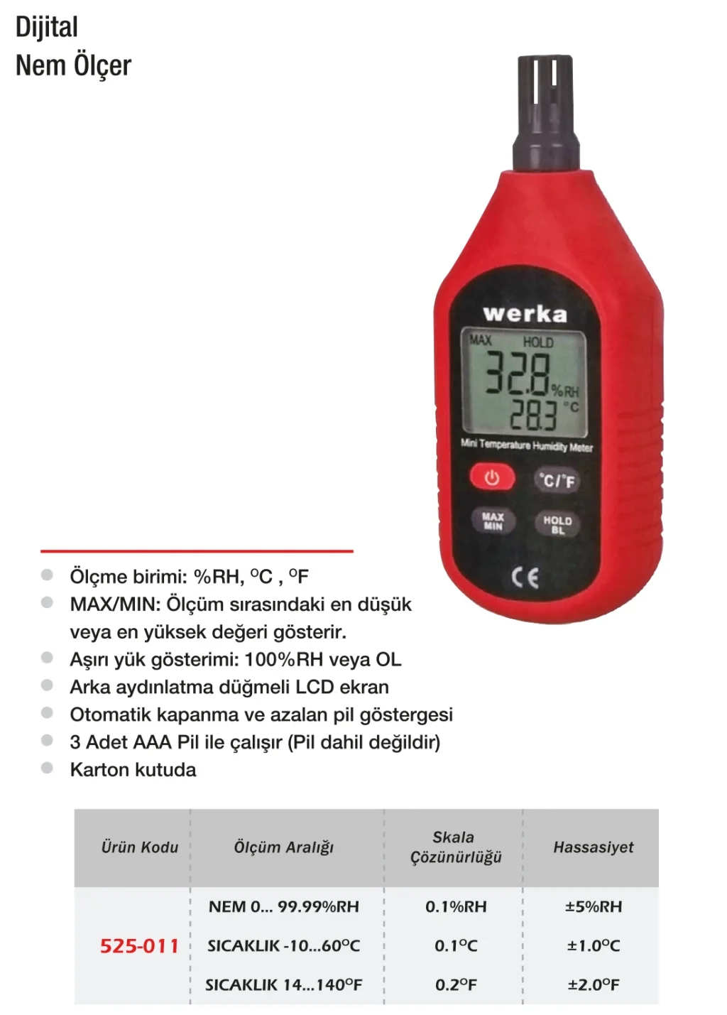 Werka Mini Dijital Nem Ölçer, ortam nemini anlık olarak ölçmek için tasarlanmış taşınabilir ve pratik bir cihazdır. Dijital ekranı sayesinde sonuçlar hızlı ve net bir şekilde görüntülenir. Ev, ofis, laboratuvar, seralar ve depolar gibi nem kontrolünün önemli olduğu alanlarda kullanıma uygundur. Hafif ve ergonomik tasarımı sayesinde cepte taşınabilir. Hızlı tepki süresi ve düşük enerji tüketimi ile öne çıkan ürün, çevresel koşulları dengelemek isteyen kullanıcılar için ideal bir seçimdir.