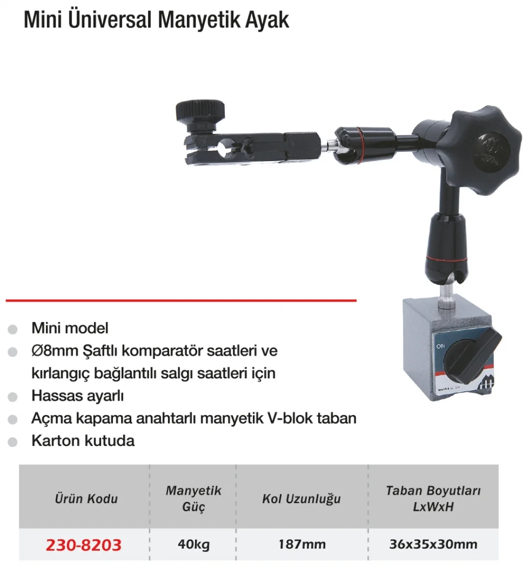 Werka Mini Üniversal Manyetik Ayak, dar alanlarda çalışmaya uygun olarak tasarlanmış, 40 kg çekim gücüne sahip bir manyetik sabitleyicidir. Kompakt gövdesi sayesinde küçük makinelerde, taşınabilir ölçüm setlerinde ve sınırlı alanlarda rahatlıkla kullanılır. Mafsallı kol yapısı ile cihaz pozisyonu serbestçe ayarlanabilir. Komparatör ve salgı saatleriyle uyumludur. Hafifliği ve esnekliği sayesinde mobil kullanım ve hızlı ölçüm ihtiyaçlarında idealdir.