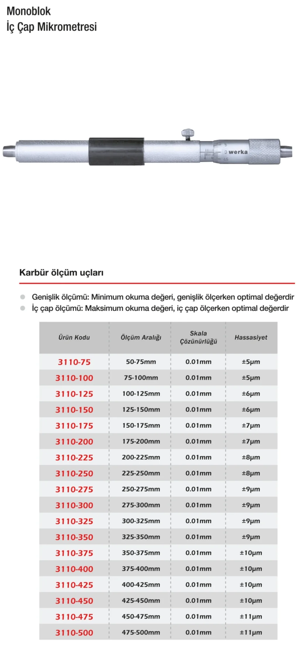 Werka Monoblog İç Çap Mikrometresi, yekpare (tek parça) gövdesiyle ölçüm kararlılığını ve dayanıklılığı artırır. Bu yapı, dış etkilere karşı daha stabil ve uzun ömürlü bir kullanım sunar. Monoblok mikrometreler, özellikle ölçüm tekrarlanabilirliğinin önemli olduğu kalite kontrol süreçlerinde fark yaratır. Ergonomik kullanım, hassas ayar mekanizması ve kaliteli işçilik ile Werka güvencesi bir araya gelir.