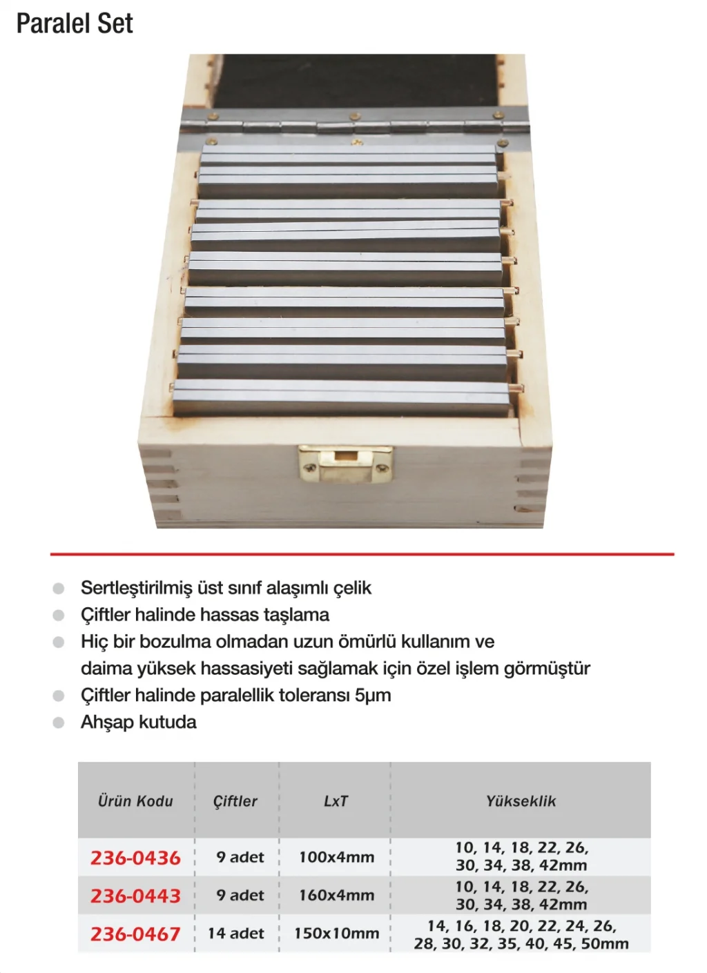 Paralel setler, aynı zamanda mengene içinde parça sıkıştırma işlemlerinde deformasyonu engellemek ve düzgün yüzey desteği sağlamak için de vazgeçilmezdir. Atölyelerden kalıp üretim tesislerine, hassas ölçüm istasyonlarından Ar-Ge departmanlarına kadar birçok alanda tercih edilen bu set, uzun ömürlü yapısı ve yüksek doğruluk seviyesi ile kullanıcıya profesyonel bir ölçüm desteği sunar.