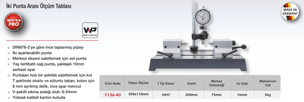 Werka Pro İki Punto Arası Ölçüm Tablası, torna milleri, selendirekler ve uzun parçaların boy, merkezleme ve salgı ölçümlerini yapmak için tasarlanmıştır. Ayarlanabilir punta mekanizması ile farklı boyuttaki iş parçalarına kolayca uyum sağlar. Kompratör veya salgı saati ile birlikte kullanılabilir. Üretim sonrası kalite kontrol süreçlerinde, doğrusal simetri analizlerinde ve parçanın eksensel hatalarının tespitinde yüksek performans sunar.