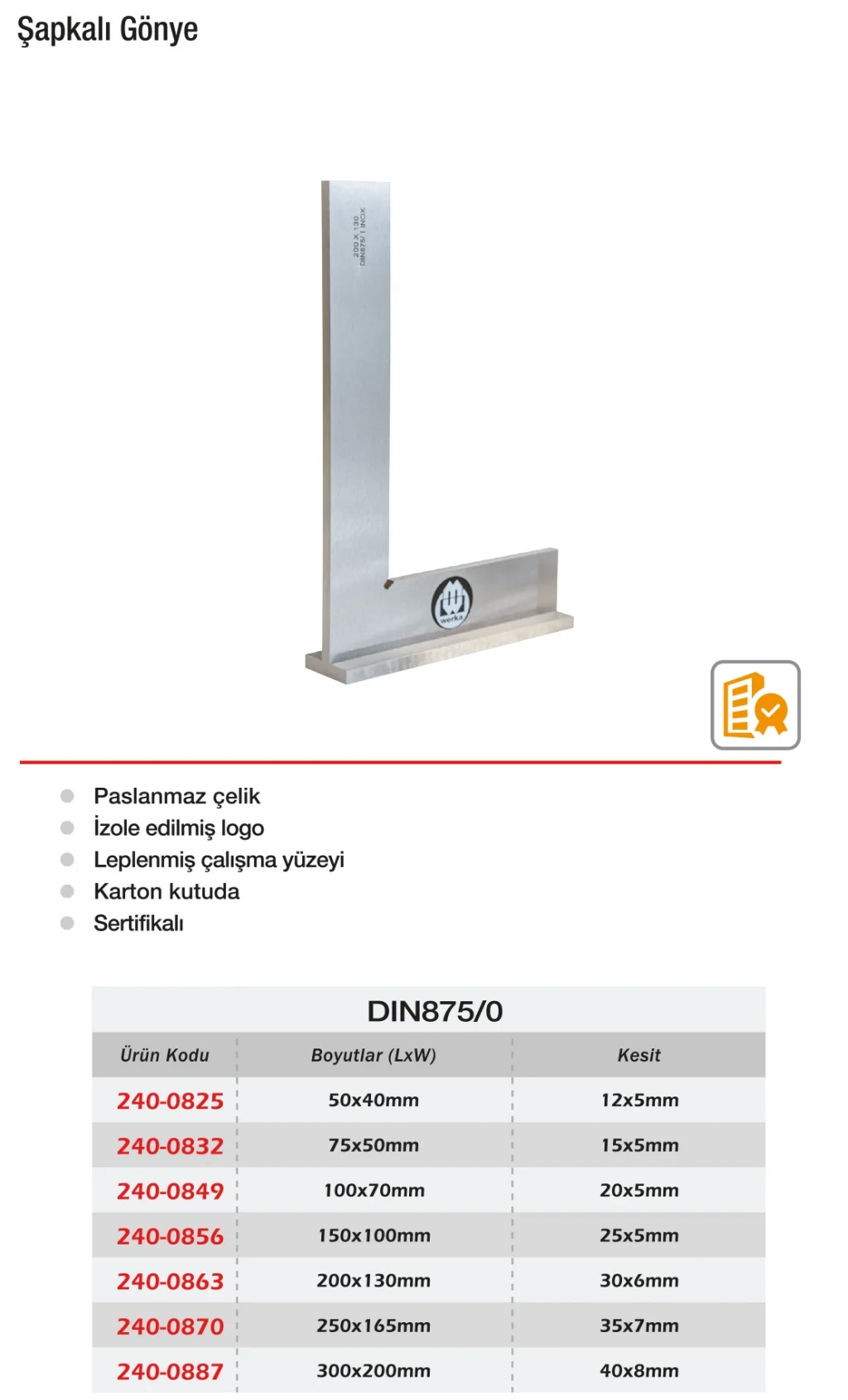 Werka Şapkalı Gönye serisi, DIN875 normlarına göre DIN875/2 (standart), DIN875/1 (hassas) ve DIN875/0 (yüksek hassasiyetli) olmak üzere üç ayrı sınıfta üretilmektedir. Şapkalı yapısı, düzleme yüzeyiyle mükemmel temas sağlar ve gönye pozisyonunun stabilitesini artırır. Sertleştirilmiş çelik yapısı ve taşlanmış yüzeyleri sayesinde doğruluk ve dayanıklılık sunar. Bu gönye çeşitleri, hem kaba montaj hem de hassas ölçüm işlemlerine göre farklı ihtiyaçlara yanıt verir. Endüstriyel üretimden eğitim alanına kadar geniş kullanım sahasına sahiptir.
