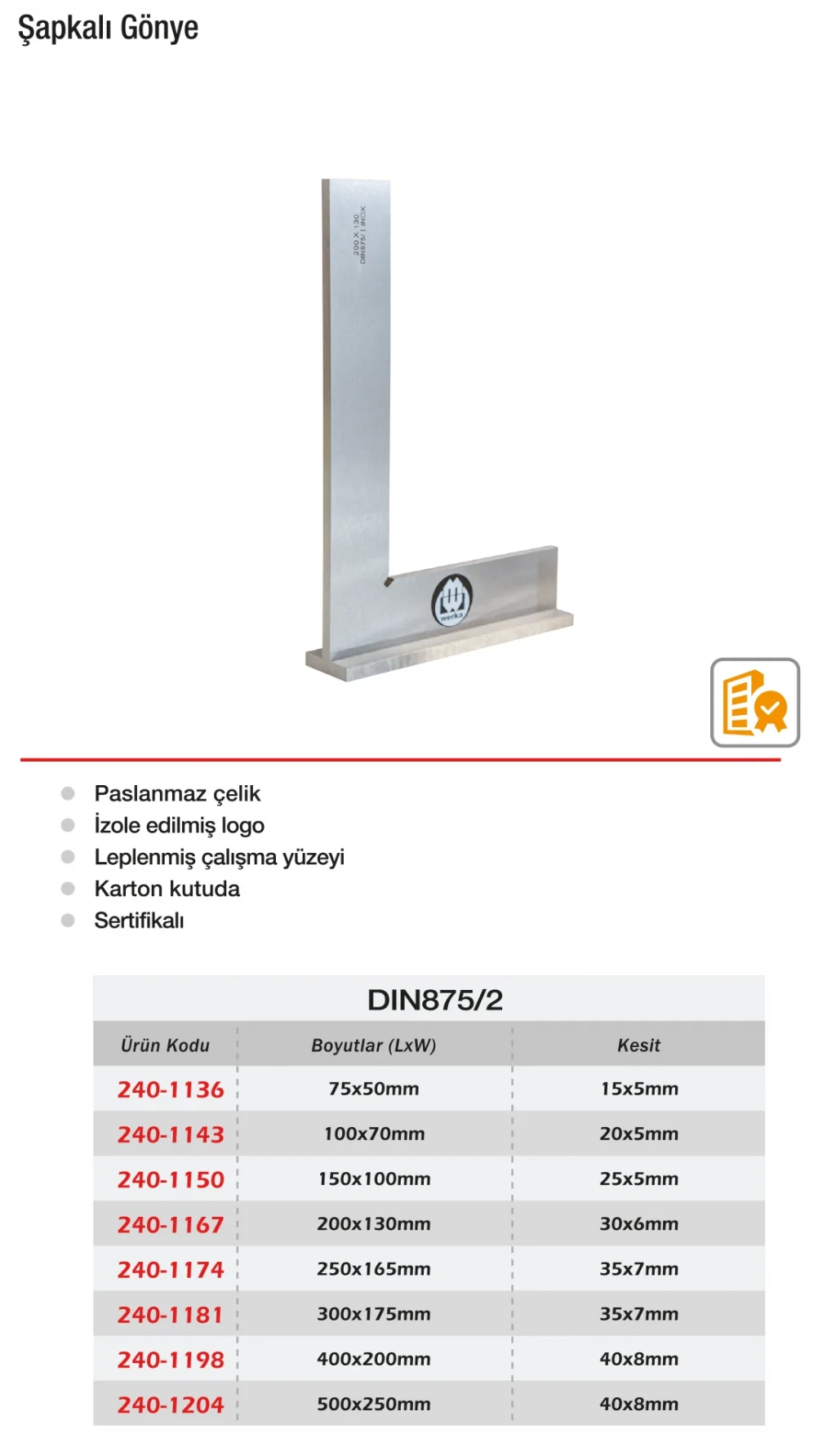 Werka Şapkalı Gönye serisi, DIN875 normlarına göre DIN875/2 (standart), DIN875/1 (hassas) ve DIN875/0 (yüksek hassasiyetli) olmak üzere üç ayrı sınıfta üretilmektedir. Şapkalı yapısı, düzleme yüzeyiyle mükemmel temas sağlar ve gönye pozisyonunun stabilitesini artırır. Sertleştirilmiş çelik yapısı ve taşlanmış yüzeyleri sayesinde doğruluk ve dayanıklılık sunar. Bu gönye çeşitleri, hem kaba montaj hem de hassas ölçüm işlemlerine göre farklı ihtiyaçlara yanıt verir. Endüstriyel üretimden eğitim alanına kadar geniş kullanım sahasına sahiptir.