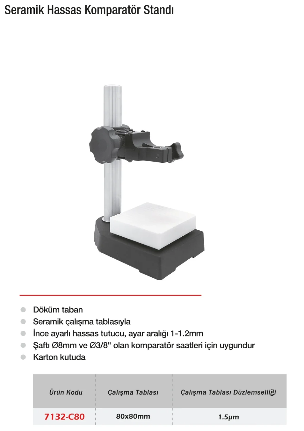 Werka Seramik Hassas Kompratör Standı, özellikle elektriksel izolasyon gerektiren ölçüm uygulamaları için tasarlanmıştır. 80x80 mm'lik taban ölçüsüyle kompakt bir yapıya sahip olan bu ürün, ölçüm esnasında statik yüklerden etkilenmez. Seramik yüzeyin düzgünlüğü ve sıcaklık değişimlerine karşı direnci sayesinde ölçüm hassasiyeti korunur. Laboratuvar uygulamaları, test cihazları ve özel üretim hatlarında kullanıma uygundur.