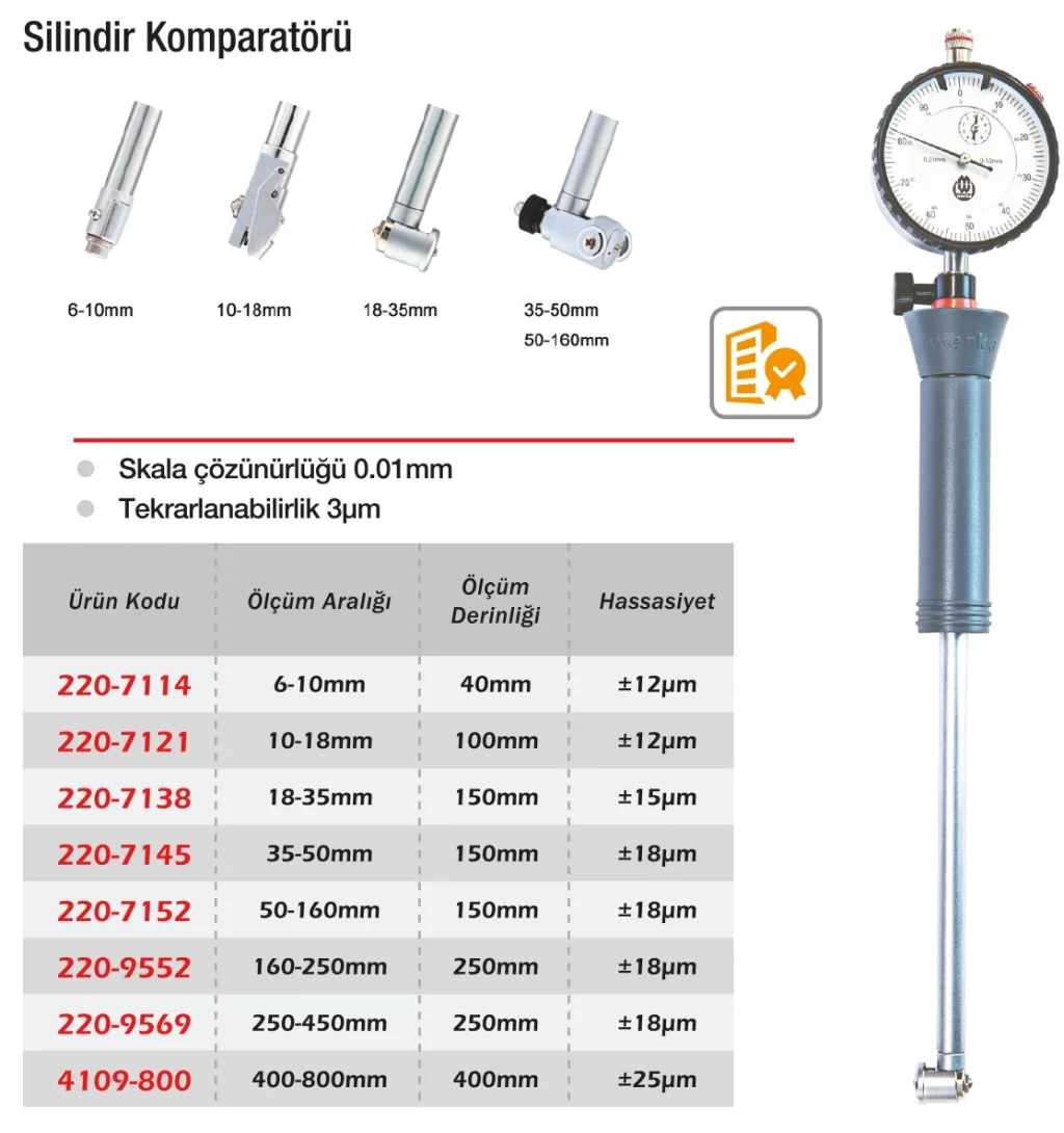Werka Silindir Kompratörü, silindirik parçaların iç çaplarını yüksek hassasiyetle ölçmek için geliştirilmiştir. Üç temas noktası ve ayarlanabilir başlıkları ile ölçüm yapılan yüzeye dengeli basınç uygular, böylece hatasız veri elde edilmesini sağlar. Kompratör saatleriyle entegre çalışabilen bu cihaz, iç çap, ovalite ve dairesellik gibi parametreleri kontrol etmek için idealdir. Dayanıklı gövdesi, ergonomik tasarımı ve çeşitli temas uçlarıyla hem teknik hem de üretim alanlarında profesyonel çözümler sunar.