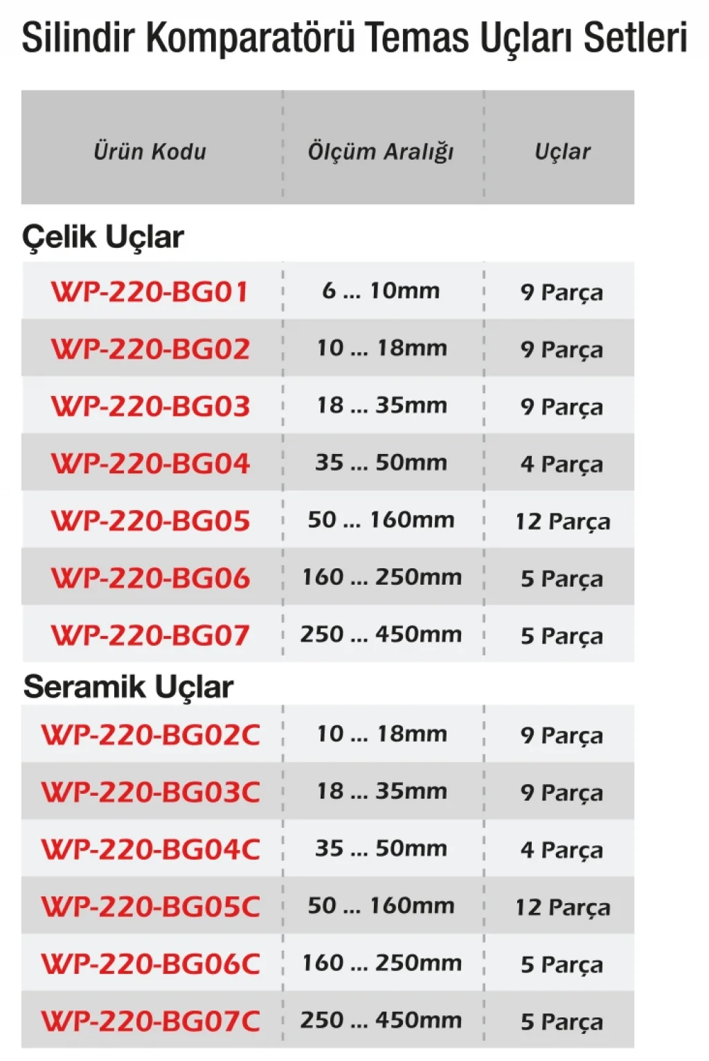 Werka Silindir Kompratörü Çelik / Seramik Temas Uçları Setleri, iç çap ölçümlerinde farklı yüzey türlerine uyum sağlayabilen çok yönlü bir çözümdür. Set içerisindeki uçlar, çelik ve seramik seçenekleri ile hem dayanıklılığı hem de çizilmeye karşı hassasiyeti bir arada sunar. Seramik uçlar özellikle yumuşak yüzeyli veya kaplamalı parçaların ölçümünde kullanılırken, çelik uçlar genel endüstriyel yüzeylerde mükemmel performans gösterir. Bu set, Werka silindir kompratörleriyle tam uyumludur ve ölçüm doğruluğunu artırır.