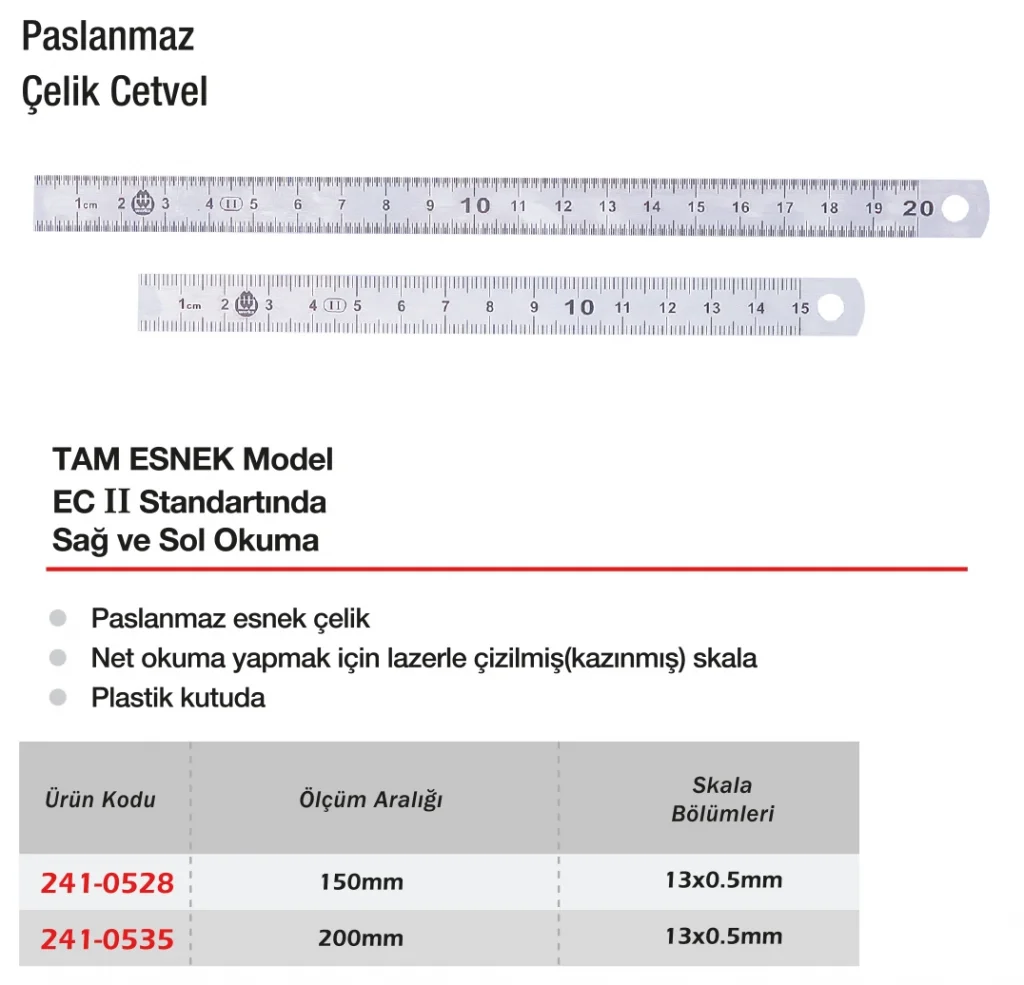 Werka Tam Esnek Paslanmaz Çelik Cetvel, özellikle kavisli, yuvarlak veya zor erişilen yüzeylerde hassas ölçüm yapmak için geliştirilmiş ergonomik bir üründür. Tam esnek yapısı sayesinde borular, oluklar ve özel geometrili yüzeylerde bile doğrulukla ölçüm sağlar. Paslanmaz çelikten üretilmiş olması sayesinde paslanmaya ve deformasyona karşı dayanıklıdır. İnce ve hafif tasarımı, teknik çizimlerden el işlerine kadar geniş uygulama alanı sunar. Göz alıcı net baskıları sayesinde kolay okunabilir. Endüstriyel, eğitim ve hobi amaçlı kullanıma uygundur.