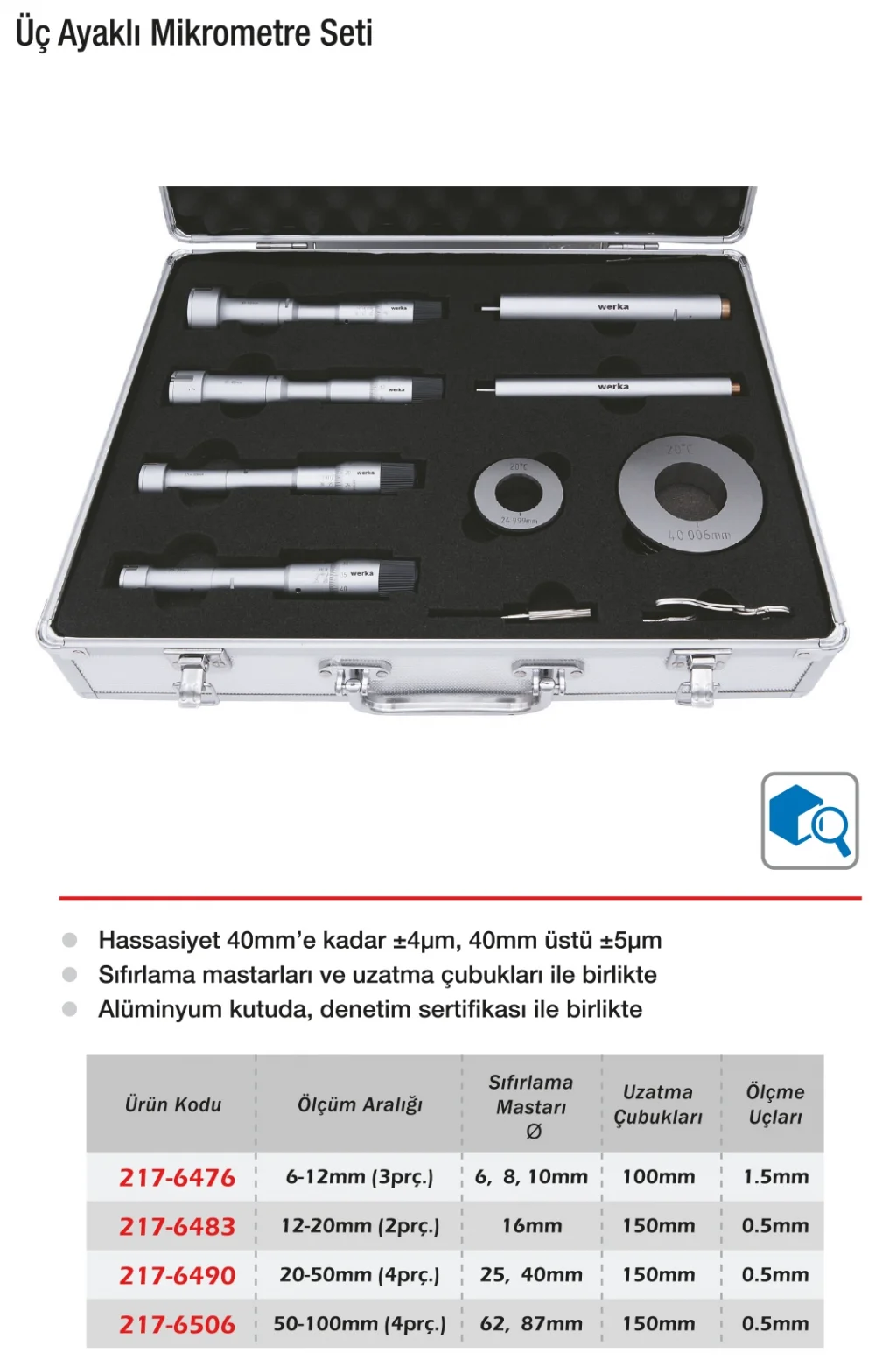 Werka İç Çap Mikrometresi, özellikle silindirik delik ve boşlukların çaplarını kesin doğrulukla ölçmek için tasarlanmıştır. Üç temas noktalı ölçüm mekanizması sayesinde, ölçüm yüzeyinde dengeli temas sağlar ve hata oranını minimuma indirir. Kolay okunabilir ekranı ve sağlam yapısıyla hem tezgâh üstü hem de üretim hattı kullanımlarında idealdir. Kalite kontrol süreçlerinde vazgeçilmez bir yardımcıdır.
