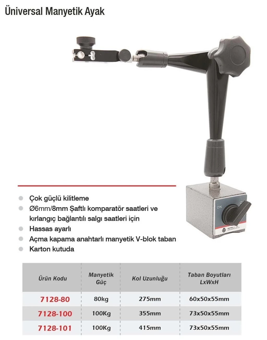 Werka Üniversal Manyetik Ayak, çeşitli ölçüm cihazlarının metal yüzeylere sağlam şekilde sabitlenmesini sağlayan pratik bir çözümdür. Hareketli mafsallı kolu, cihazın konumlandırılmasını kolaylaştırırken, kilit mekanizması sayesinde ayarladığınız pozisyonda sabit kalır. Komparatör, salgı saati ve benzeri göstergelerle tam uyumludur. Orta ölçekli iş parçalarında rahatlıkla kullanılabilir. Hassas ölçümlerde istikrarlı sonuçlar almak isteyen teknisyenler ve operatörler için idealdir.