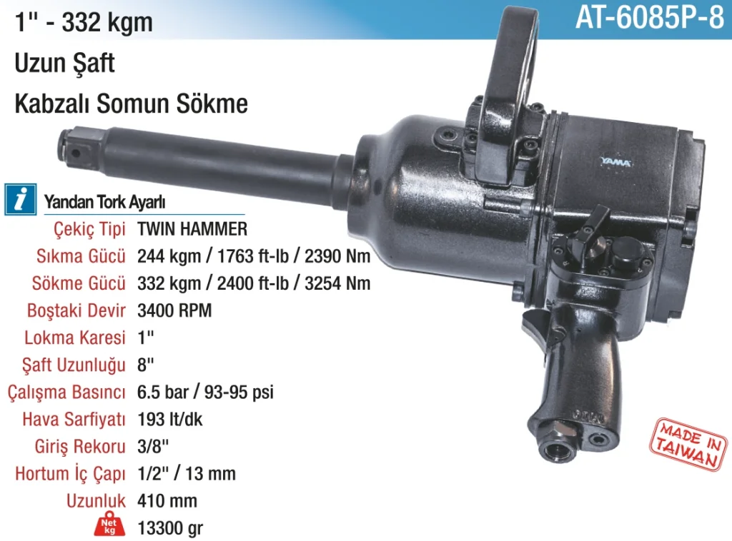 1" 332 kg 3400 RPM 8" Şaft Kabzalı Havalı Somun Sökme, endüstriyel kullanımlar için tasarlanmış güçlü ve dayanıklı bir pnömatik araçtır. 3400 RPM hızında çalışan bu somun sökme cihazı, 332 kg tork kapasitesi ile büyük çaplı ve zorlu somunları etkili bir şekilde sökme gücüne sahiptir.