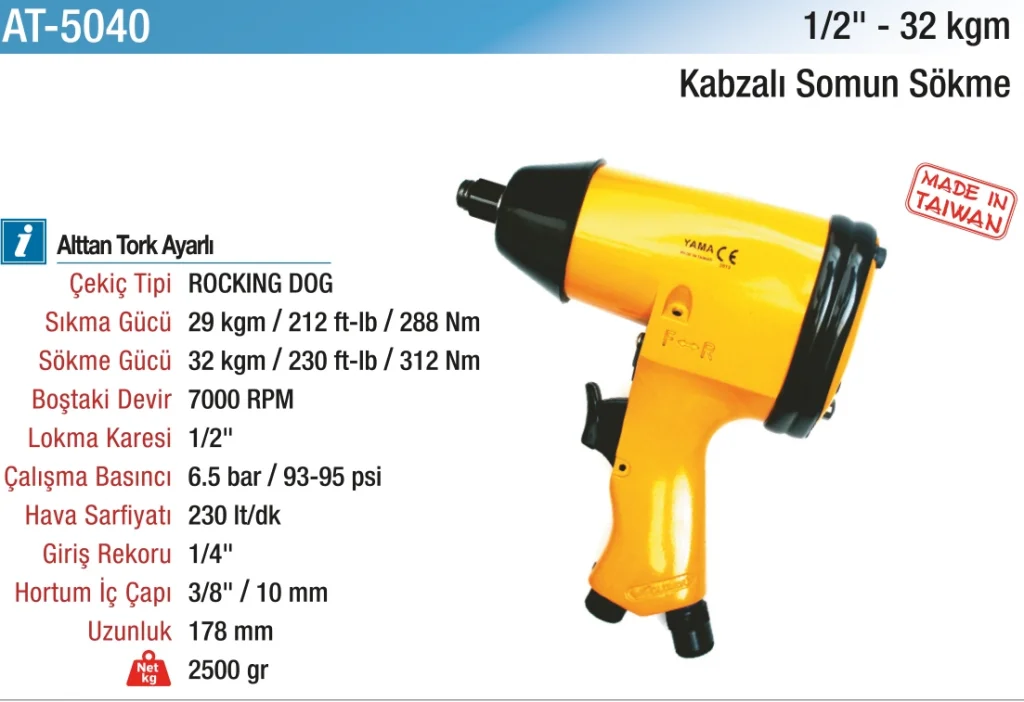 1/2" 32 kg 7000 RPM Kabzalı Havalı Somun Sökme, profesyonel kullanıcılar için ergonomik ve güçlü bir pnömatik çözümdür. Hem verimlilik hem de dayanıklılık sağlar.